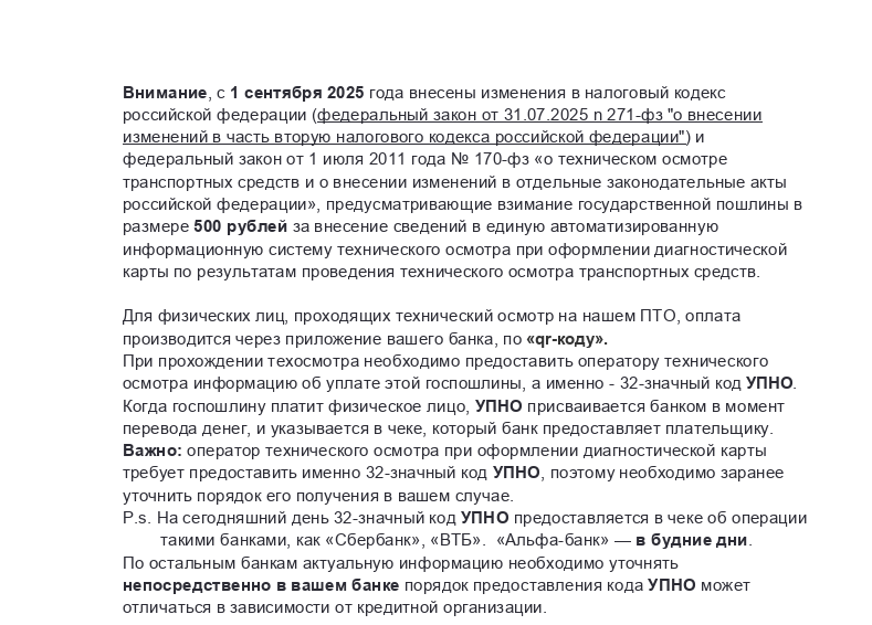 С 1 сентября 2025-го в России вводится госпошлина 500 рублей за внесение данных в Единую автоматизированную информационную систему техосмотра (ЕАИСТО), она обязательна для уплаты при прохождении техосмотра автомобиля.